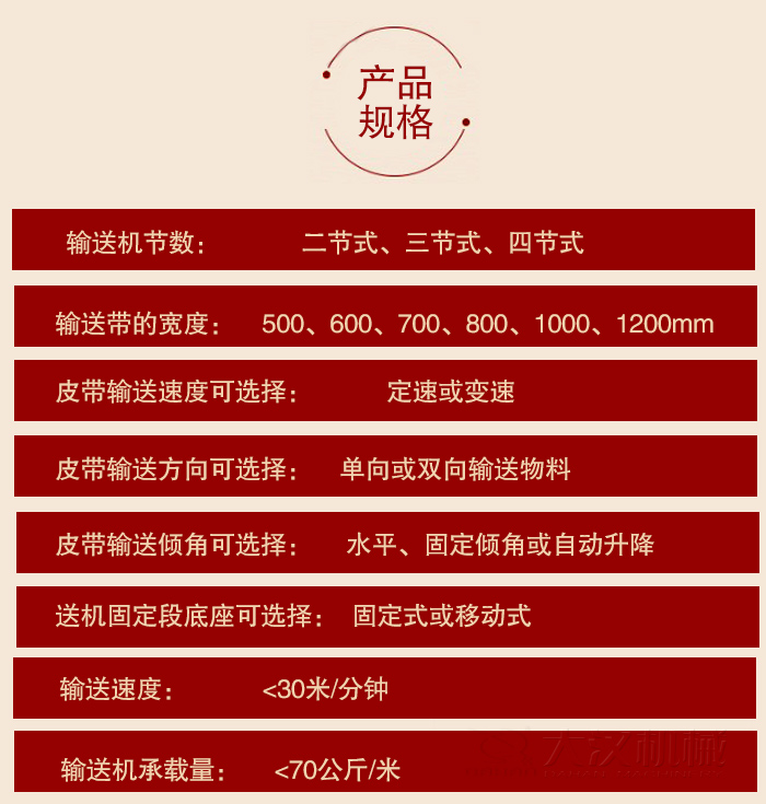 輸送機節(jié)數(shù):二節(jié)式、三節(jié)式、四節(jié)式。 輸送帶的寬度:500、600、700、800、1000、1200mm。 皮帶輸送速度可選擇:定速或變速。 皮帶輸送方向可選擇:單向或雙向輸送物料。 皮帶輸送傾角可選擇:水平、固定傾角或自動升降。 輸送機固定段底座可選擇:固定式或移動式。 輸送速度:<30米/分鐘。 輸送機承載量:<70公斤/米。